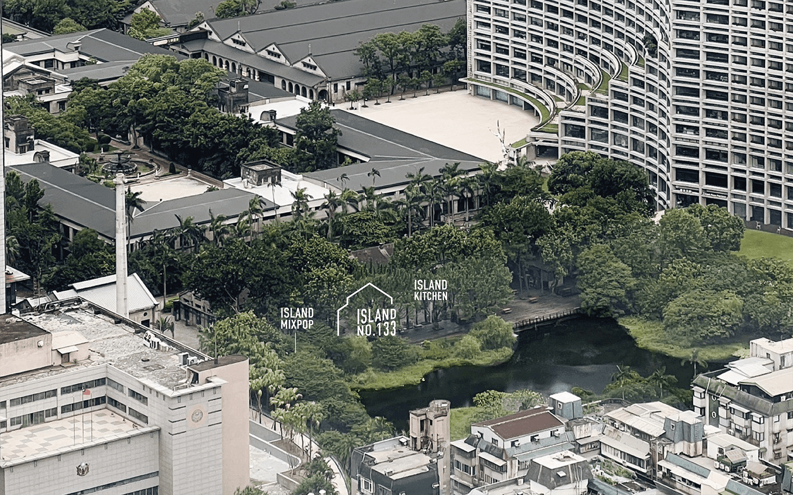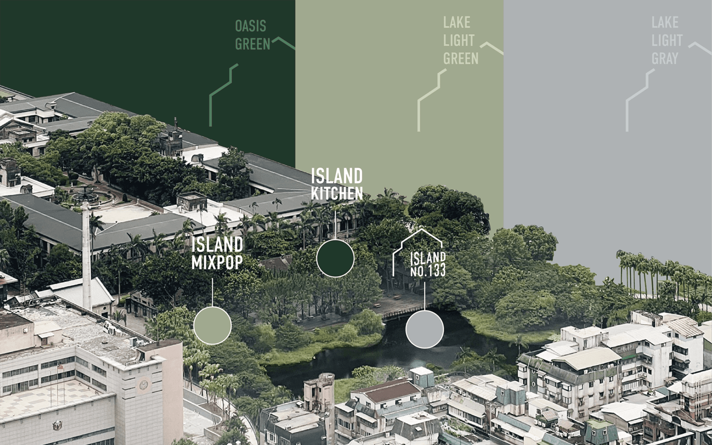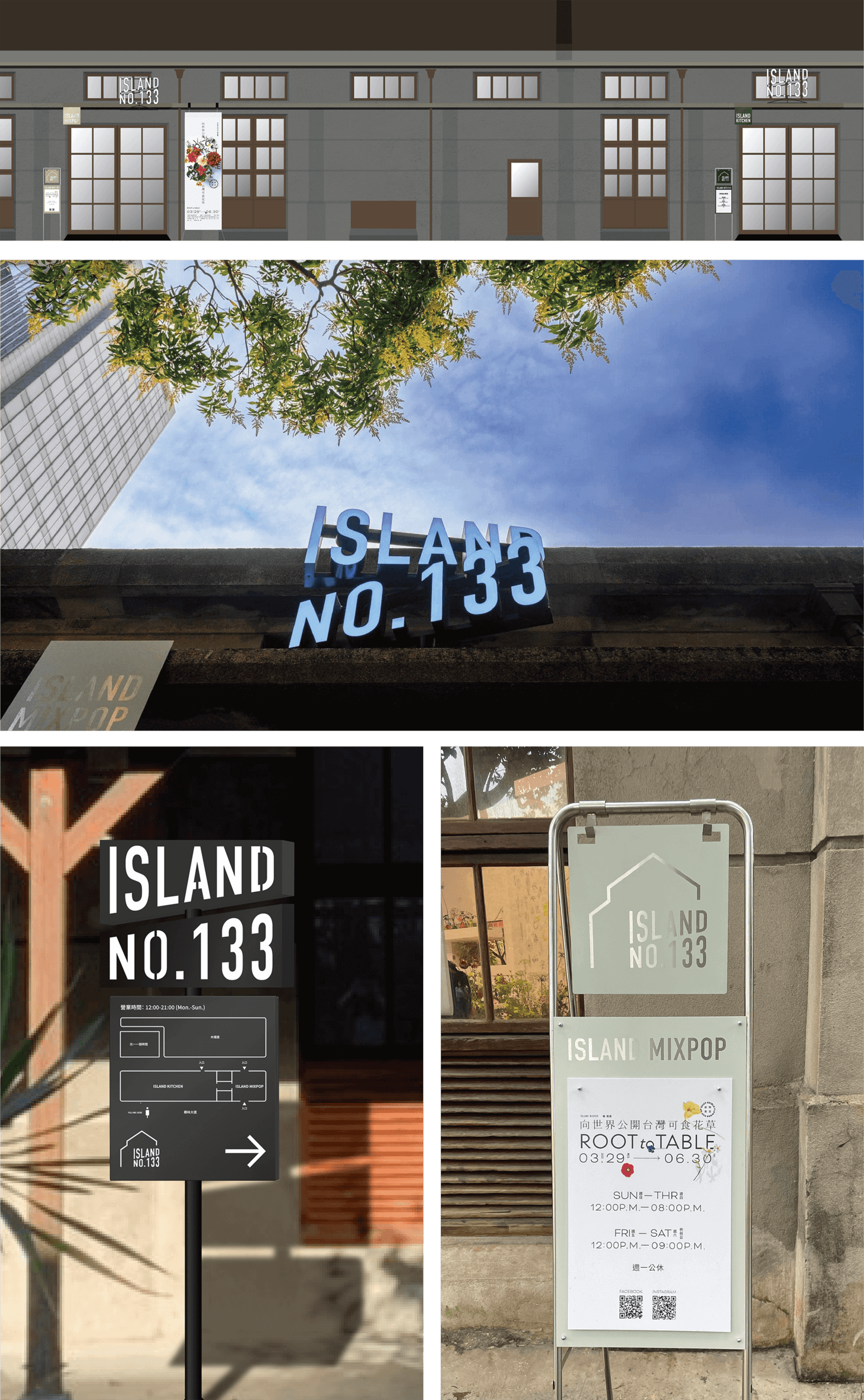 ISLAND133座落在松山文創園區生態湖畔的機器修理廠,就像一座城市綠洲,是松菸的中島,是臺北的中島,也是臺灣的中島。從臺灣出發到世界各地,或從世界看臺灣。囍樹以中島生活為場域概念,實現這裡是城市中生活的重心以及人與人交流互動、分享體驗的地方,透過展覽及料理的形式,開啟設計、策展與台灣在地文化的對話,並構築出木構造的歷史古蹟裡的多樣生活體驗旅程。識別設計以古蹟建築的側寫輪廓加上中間斜體字的方塊體構成,呼應 「ISLAND MIX POP」在木構的古蹟空間中,打造一個空間中的空間,依主題變化使用型態,可開可收,更具互動及動態感。