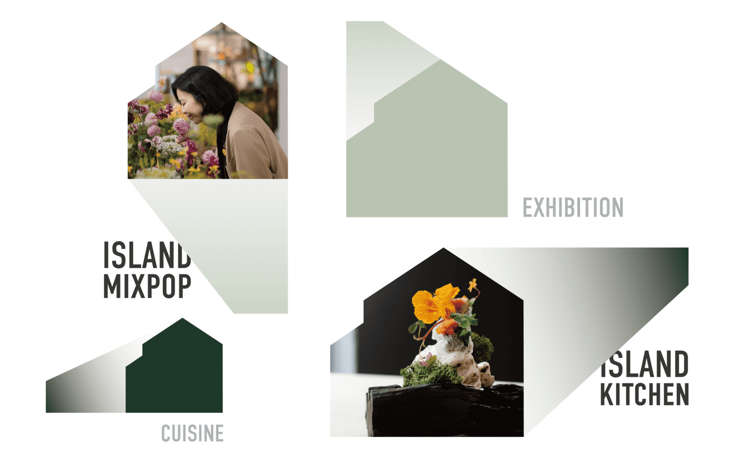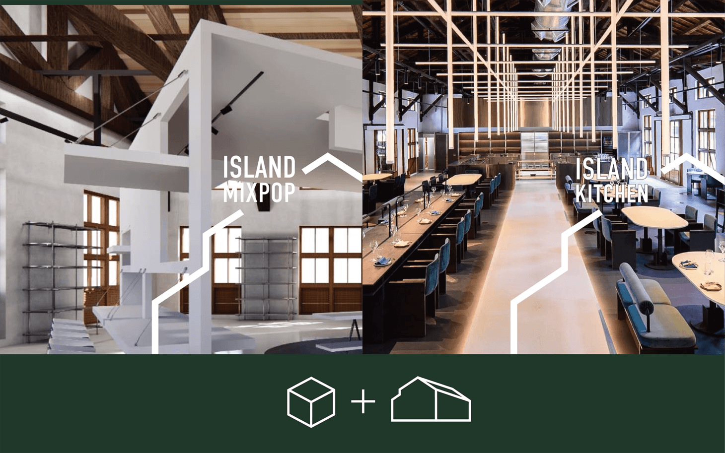 建築以餐飲空間「ISLAND KITCHEN」及策展空間「ISLAND MIX POP」兩個空間構成,外立面識別形象以「動態可變化角度」的設計概念來發展,跳脫以往靜態、單一固定的模式,一起演繹未來空間與內容的不斷演化和創新。視覺應用系統則以開放和延展性的幾何色塊與線條為設計架構來詮釋更混血、跨界、多樣的場域精神!