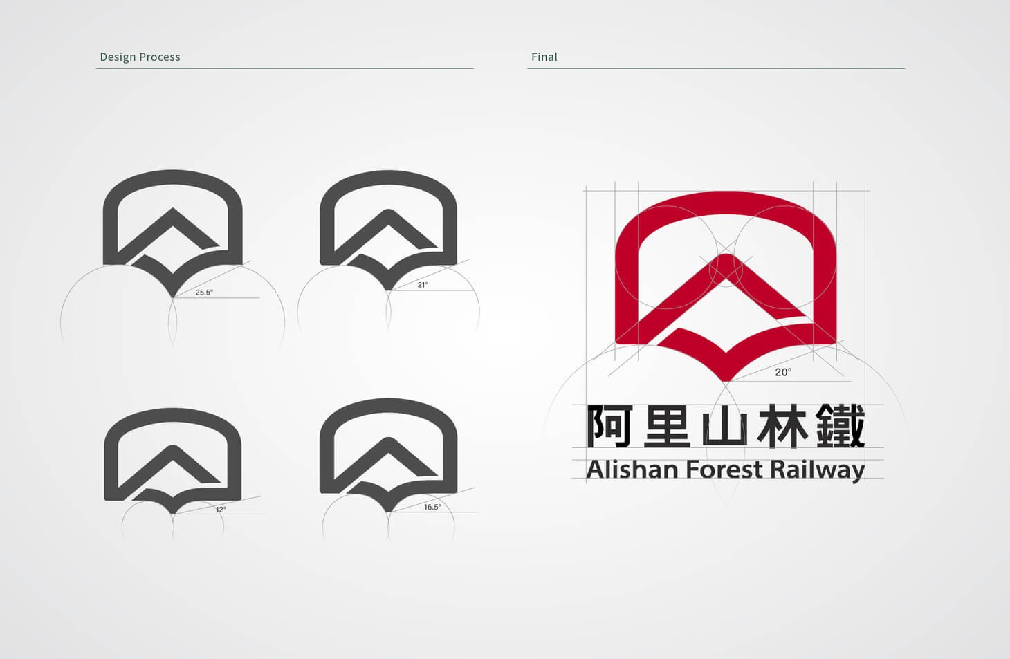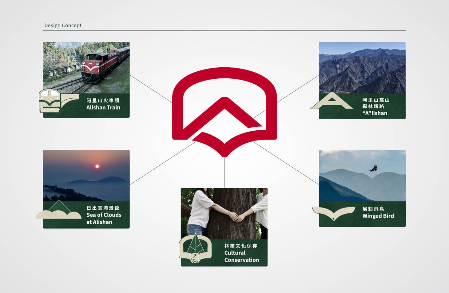 囍樹團隊以「穿梭山林歷史,細賞窗中景致風光」為設計概念,標誌識別結合火車的窗景,融入阿里山的火車頭、日出雲海景致、展翅飛向未來的飛鳥以及隱喻守護阿里山林鐵與文化資產的決心;識別中的V形弧度如同林鐵對於安全運輸的重視,呈現舒適、穩定的視覺效果;字面大且肚圍寬的黑體標準字設計靈感取自火車車身字體,帶有鐵道工業的穩重,在應用上更多元也更易於辨識。