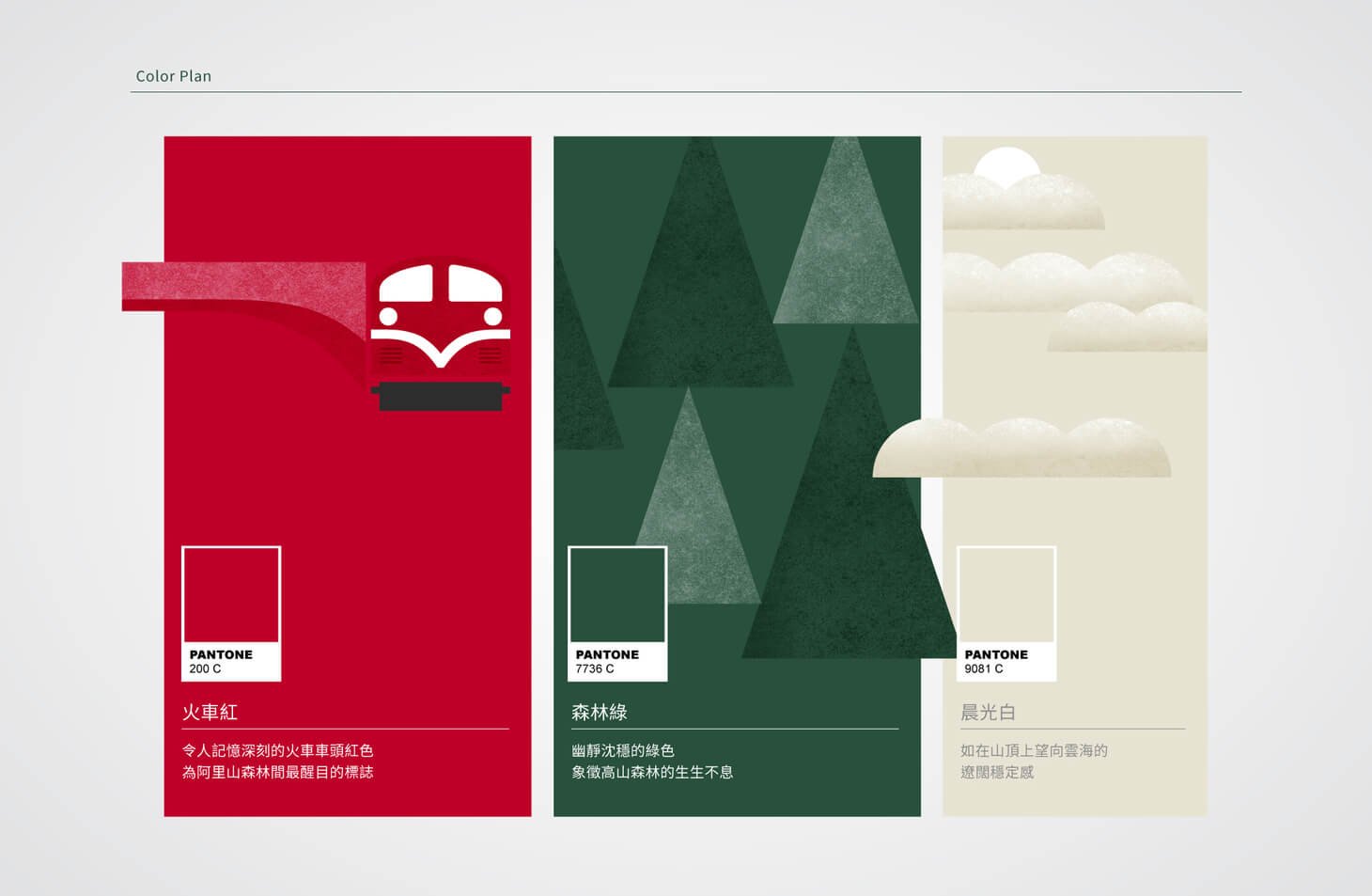品牌主色調紅色代表著令人印象深刻的火車頭紅,也是阿里山鐵路開啟觀光時代的里程碑。輔助色彩中的森林綠代表阿里山森林幽靜沈穩、生態多元的生機;以及如同在山頂望向雲海般遼闊又穩定的晨光白,使識別在呈現林業文化與鐵道精神的同時,兼具穩健和活潑的生命力,為品牌注入更多元發展的力量。 輔助圖紋富有動感的視覺效果,彷佛靠在風景流動的窗邊,細賞自然風貌。
